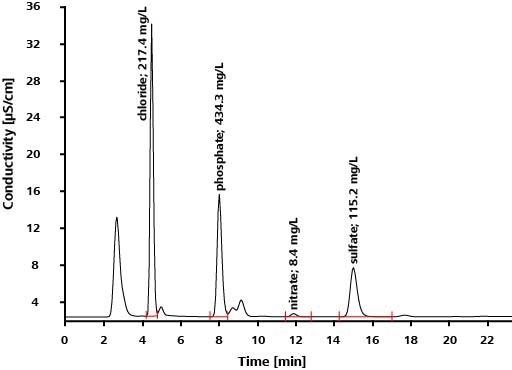 In addition, a guard column is needed upstream of the separation column to protect the latter from contamination. Separation of the analytes occurs on an anion exchange column. The system is further equipped with a conductivity detector and an anion suppressor. A sample processor permits further automation of the analyses and increases sample throughput.