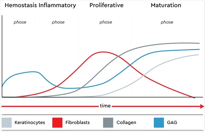 The presence of keratinocytes, fibroblasts, glycosaminoglycans (GAG) and collagen in all phases of the native wound healing process. Image credit: Promocell GmbH