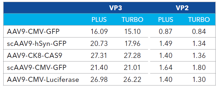 Table 2. AAV9 capsid protein ratios from Turbo CE-SDS and CE-SDS Plus. Source: Bio-Techne