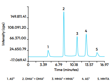 Arsenic compounds are resolved using ion exchange chromatography on a Hamilton PRP-X100 column, a 55 % cross-linked polystyrene-divinylbenzene copolymer functionalized with a quaternary ammonium anion exchanger group. The detection method is inductively coupled plasma-mass spectrometry.