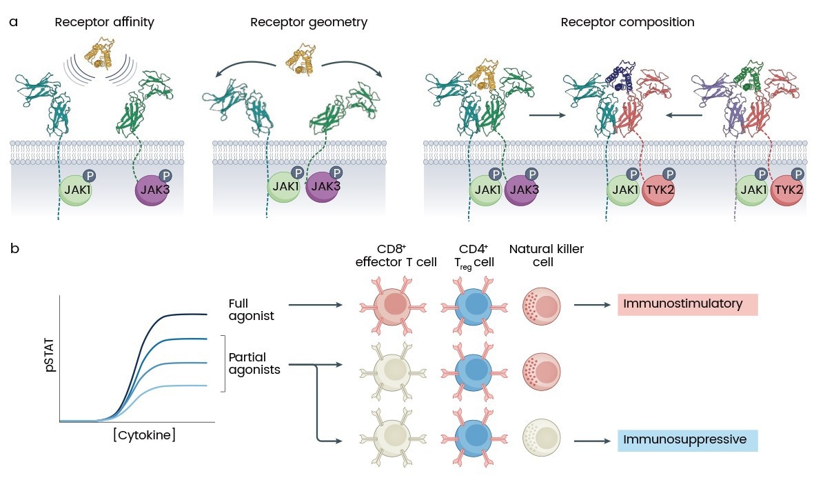 Figure 2. Tunable parameters in cytokine receptor pharmacology. (a) Model showing three controllable parameters in cytokine receptor signaling: receptor affinity, geometry/orientation, and subunit composition. (b) Cytokine partial agonists, with lower maximal signaling strength (Emax), can overcome pleiotropy by exploiting different signaling thresholds across cell populations. For example, IL-2 partial agonists can selectively expand CD4+ regulatory T cells (Treg cells) (blue) over effector CD8+ T cells or natural killer cells (red). JAK, Janus kinase; pSTAT, STAT phosphorylation4. (Source: https://doi.org/10.1038/s41573-022-00557-6)