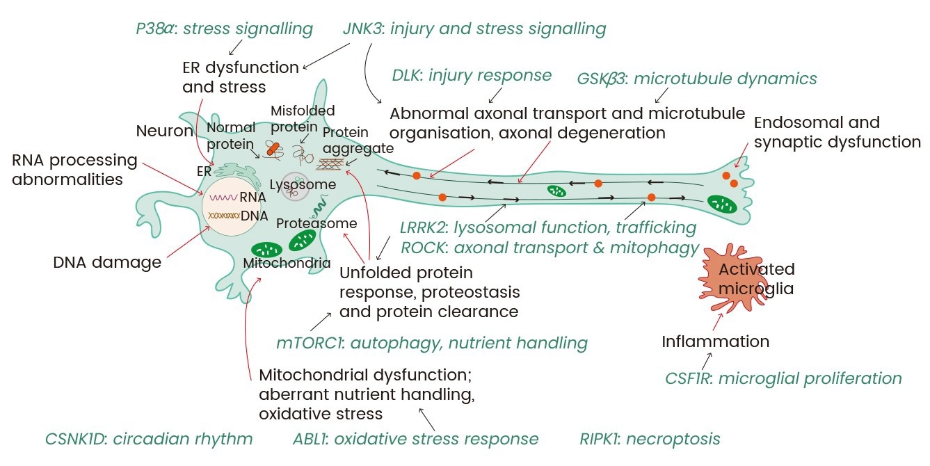 The lack of effective treatment underscores the urgency to identify novel therapeutic targets relevant to the pathology of these conditions. Kinases are considered effective targets for drug development, especially with the notable success of kinase inhibitors in cancer treatment. Nonetheless, their capabilities in treating neurodegenerative diseases have not been thoroughly investigated, offering an exciting opportunity for future studies and the creation of new therapies.