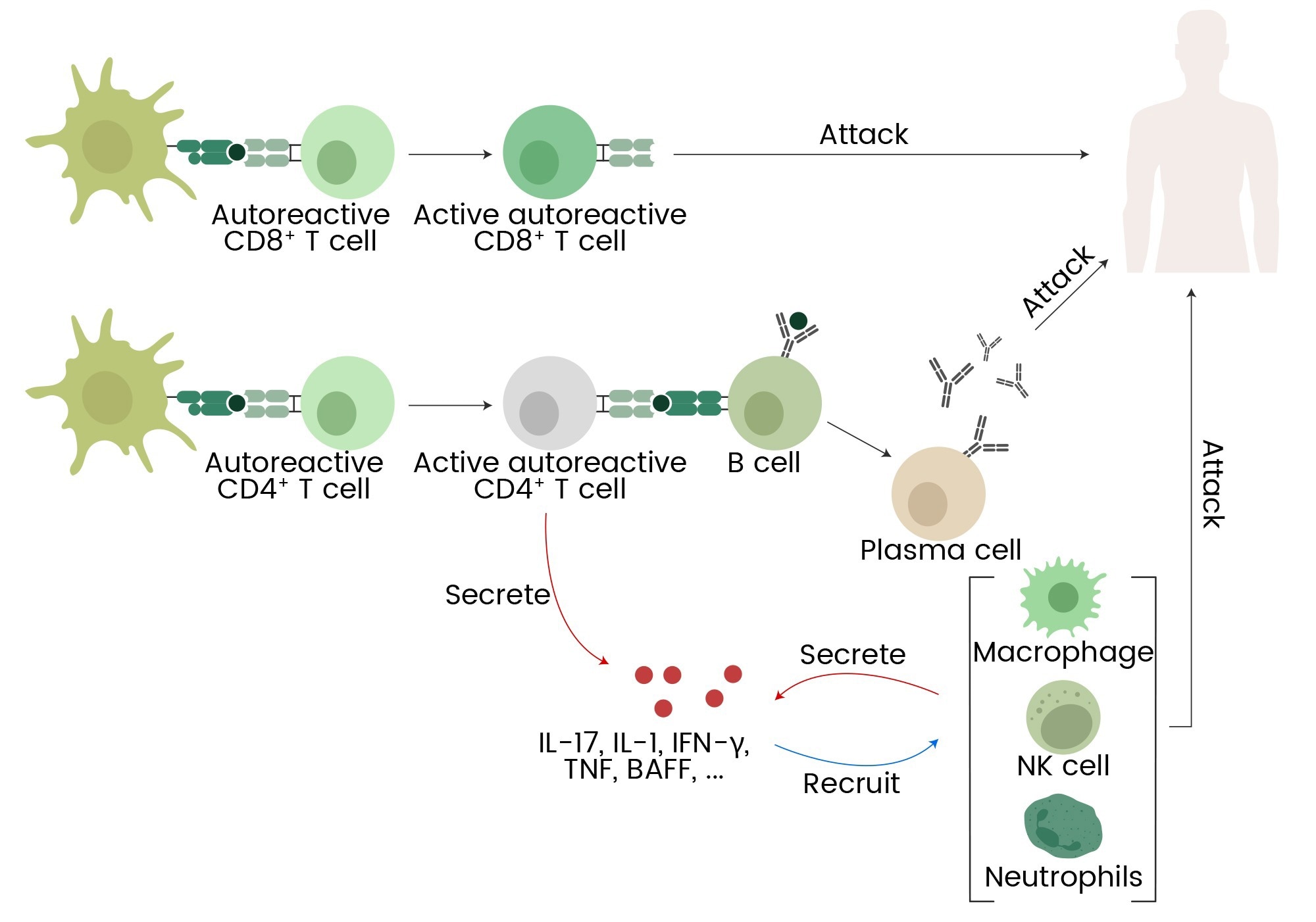 Figure 1. Autoreactive T cells, B cells, macrophages, NK cells, neutrophils, and cytokines (IL-17, IL-1, IFN-γ, TNF, BAFF) contribute to autoimmune responses and inflammation. 7 Image Credit: Sino Biological Inc.