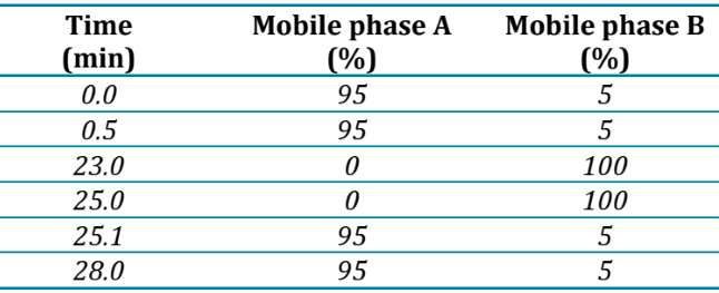 A 28-minute gradient (including equilibration time) was utilized, with 0.1 % formic acid and 2 mM ammonium acetate in water for mobile phase A and 0.1 % formic acid and 2 mM ammonium acetate in methanol for mobile phase B (Table 1). The column temperature was kept at 50 °C with a flow rate of 0.3 mL/min and an injection volume of 1 μL.