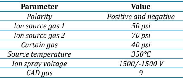 Table 2. Source and gas parameters for the analysis of pesticides and mycotoxins in food extracts using the SCIEX 7500+ system. Source: SCIEX