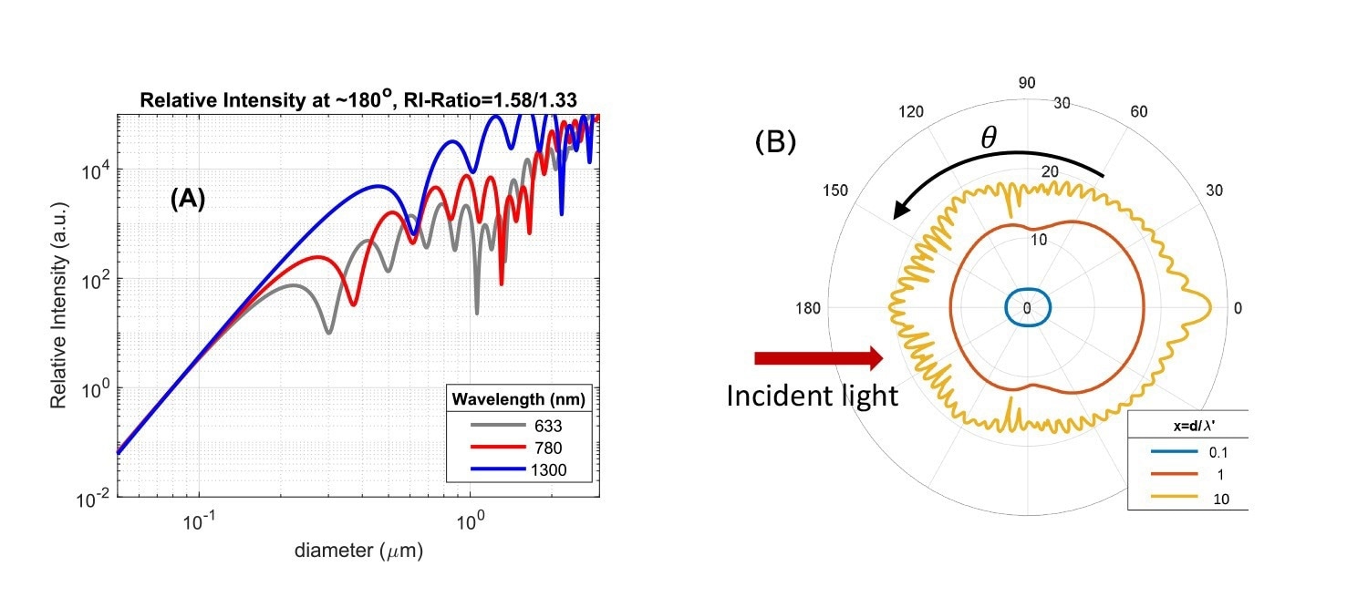 Fig. 2A: Scattered light intensity as a function of particle size, shown for three detection angles. The measurement uses a light wavelength of 633 nm and a refractive index ratio of 1.58/1.33. 2B: Scattering patterns at different angles for a single particle, based on Mie theory. Shown are three particle sizes relative to the light wavelength (size ratio = d/λ’). The refractive index of particle vs. solvent is 1.58/1.33. The red arrow shows the direction of the incoming light. Image Credit: InProcess-LSP