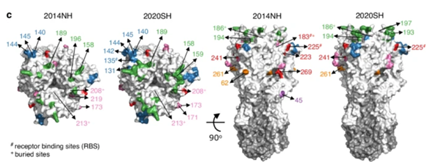 Figure 4. Key HA sites that changed between the 2014NH and 2020SH seasons, color-coded by epitope. Epitopes A and D are shown in the top view (left), and epitopes C, E, and unlabeled sites in the front view (right).8 Image Credit: Syed Awais W. Shah et al.
