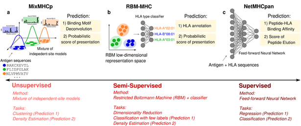 Figure 5. Examples of HLA class I antigen-presentation predictions generated by unsupervised, semi-supervised, and supervised models.10 Image Credit: Barbara Bravi.