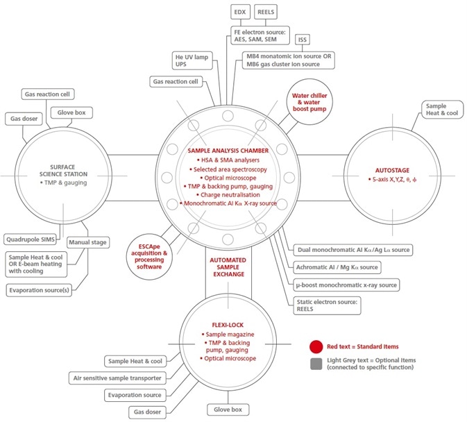 Options like surface modification and sample preparation can be fitted on the introduction chamber, also called Flexi-lock. Such options comprise sample heat and cool, broad spot ion source, air-sensitive sample transporter, crystal cleaver, and glove box.