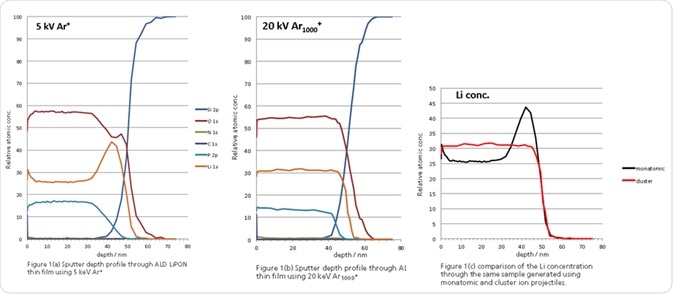 It is known that the sputter yields from inorganic materials are low when using gas clusters. This difficulty can be mitigated by using small clusters with high beam energy. Here we contrast the use of 5 keV monatomic Ar+ with 20 keV Ar1000+ ions for sputter depth profiling a lithium phosphorous oxynitrde ALD thin film where the Li distribution through the film is of interest. To ensure the depth profile is completed in reasonable time the high acceleration voltage can be used in cluster mode. There is a distinct difference between the two profiles. Under monatomic bombardment there is an initial increase in Li concentration after the first etch cycle – a result of removing surface contamination – then a subsequent reduction in Li into the bulk of the film reaching a steady-state, shown in figure 1(a). Near the LiPON interface with Si substrate the Li concentration increases.