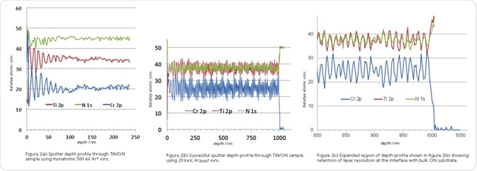Figure 2(b) shows the successful depth profile with retention of the layer structure throughout the 100 layer coating. In contrast to the monatomic profile Ar incorporation into the sample was not observed for this Ar2000+ cluster profile.