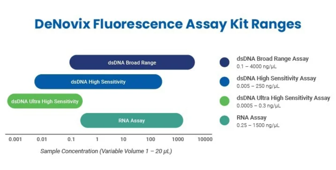The DeNovix dsDNA Fluorescence Quantification Assays and Fluorometers provide the greatest sensitivity and widest dynamic range available today. DeNovix offers three highly specific assay kits for a wide range of dsDNA concentrations and one that covers a wide range RNA concentrations.