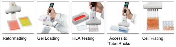The VOYAGER variable tip spacing pipettes are available in 4, 6, 8 and 12 channel versions and expand anywhere from 4.5 mm to 32.5 mm. This provides access to a wide range of labware formats such as microplates, tube racks or gel boxes. This makes the VOYAGER pipette an ideal companion for a wide variety of Genomic, Proteomic and Cell Culture applications.