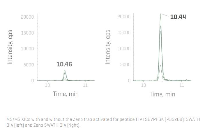 Targeted peptide quantification - Significant sensitivity gains in MS/MS. Comparison of extraction ion chromatograms (XICs) for LILTLTHGTAVC[CAM]TR fragments obtained from MS/MS collected with Zeno trap on vs. Zeno trap off. Signal/noise ratio improved ~8 fold when using the Zeno trap. Image Credit: SCIEX