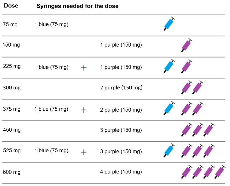 Depending on the dose prescribed to you by your doctor you may need to select one or more pens, and inject the contents of them all in order to deliver your full dose. The Dosing Table below shows the combination of pens needed to deliver your full dose.
