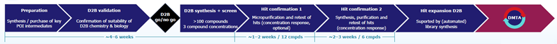 - Hits can be followed up by micropurification of the D2B reaction mixtures and by formal resynthesis of hit compounds (purified).