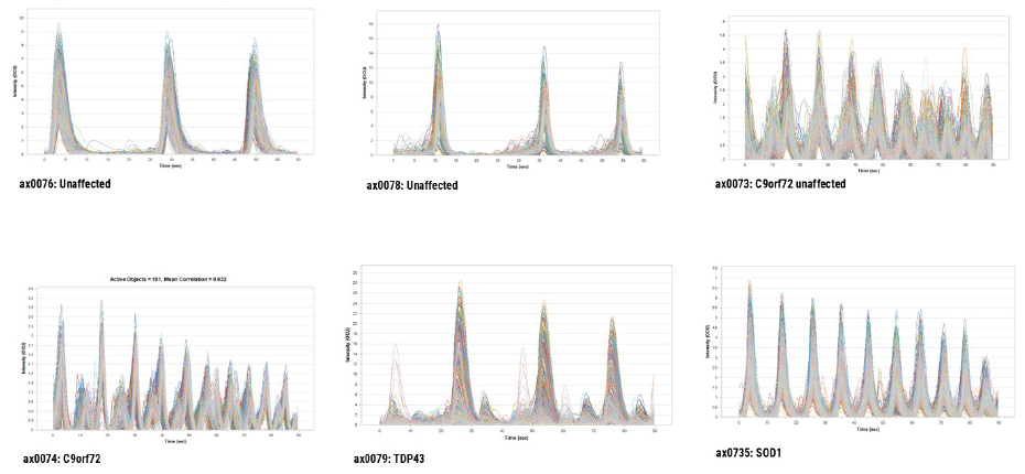 All ALS phenotype lines displayed a reproducible loss of synchronous firing and different degrees of hyperexcitability. This is in accordance with expected ALS clinical pathology and supports the case for the use of these cells in experimental in vitro models to study ALS pathology and potential therapeutics.