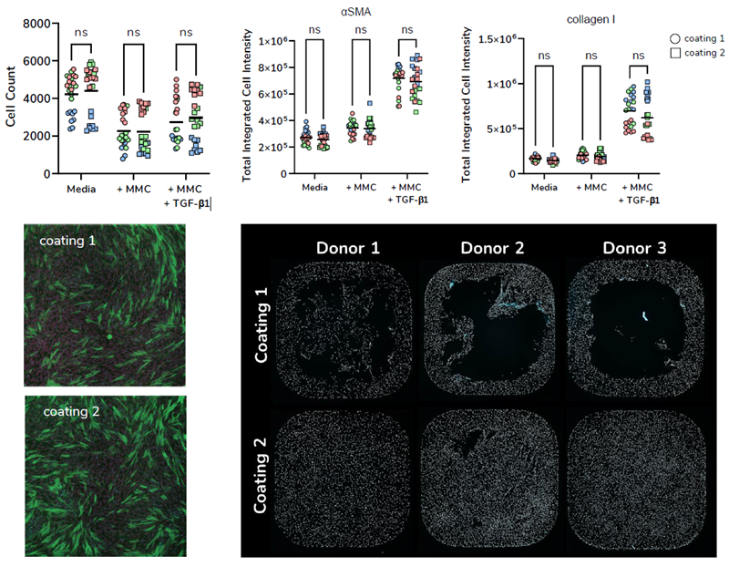 After observing significant cell detachment as a result of mechanical washing, various plate coatings were compared to enhance fibroblast attachment and reduce assay variability. Further work was conducted to optimize immunocy-to-chemical detection of α-SMA and collagen 1.
