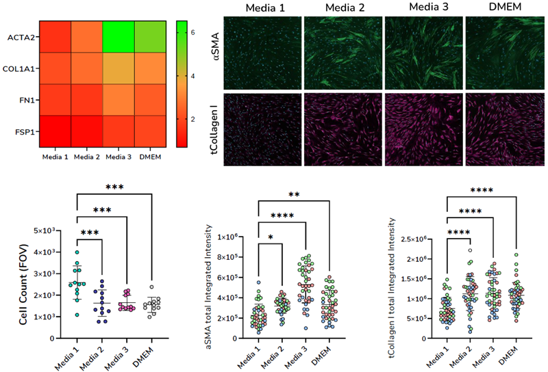 Assay culture media was optimized to promote the activation of primary fibroblasts following stimulation with TGF-β1. As shown in Figure 2, Media 3 promoted the expression of both α-SMA and collagen 1 at the gene and protein levels.