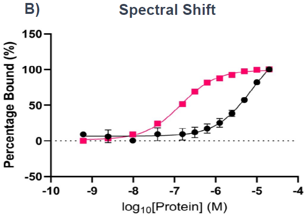 Figure 2. NanoTemper spectral shift assay showing ∼50-fold enhancement (α = 51.4) of a weak protein-protein interaction by a molecular glue compound (red) vs. DMSO control (black). Image Credit: Image courtesy of Philip Rawlins et al., in partnership with ELRIG (UK) Ltd.