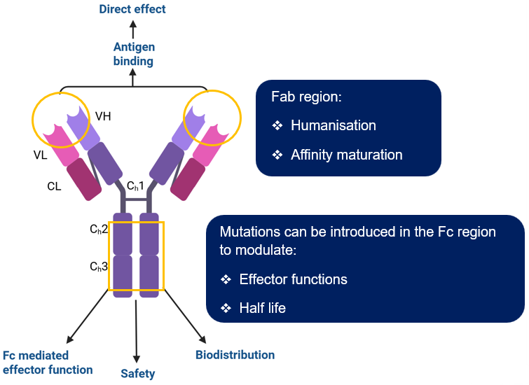 An antibody activates the immune system's cellular and cytoplasmic defence to combat a pathogen. This occurs via interactions of the Fc (CH2-CH3) region to activate three effector function pathways and impacts half-life of antibody (Figure 1). These can be modulated via several Fc mutations to achieve bespoke effects, specific to project needs.