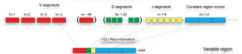 • Genetic recombination of V, D, J, and C regions in T- and B-cells generates millions of different T-cell receptors (TCR) and B-cell receptors (BCR), creating a highly complex “universal response” to almost any pathogen.