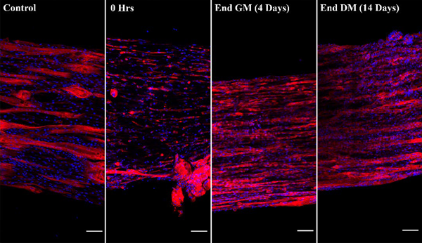 Myomaker organ 1: Chemical injury has been modelled using barium chloride, cardiotoxin and tubocurarine. Barium chloride ablates muscle fibres (left), this injury is followed by regeneration. Image Credit: Myomaker Bio