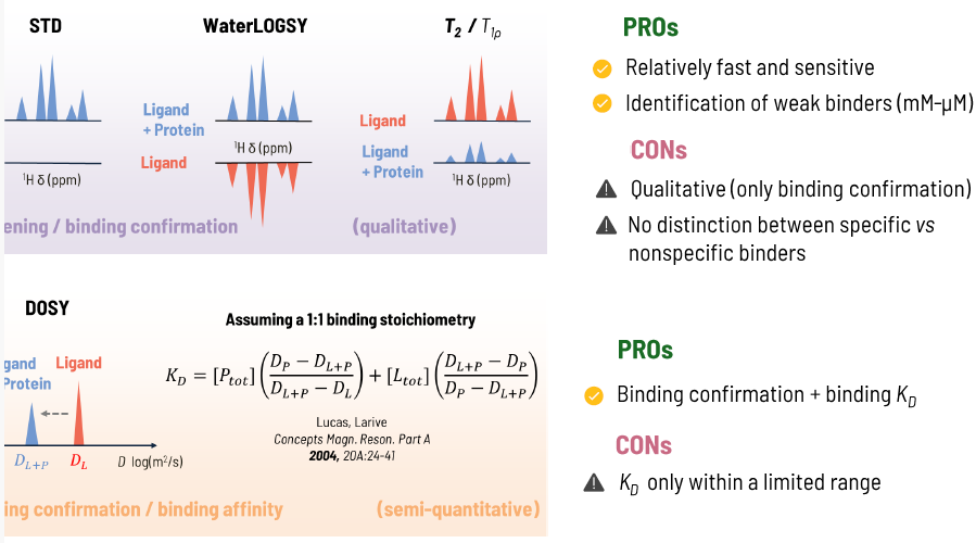 • DOSY: The diffusion coefficient of the ligand is measured and decreases upon binding to the protein. This change is proportional to the bound fraction of the ligand and can be correlated with its binding affinity (KD).