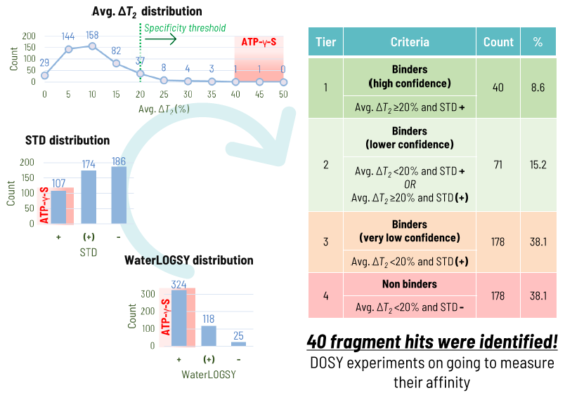 The synergistic use of STD, WaterLOGSY, and T2 experiments led to the identification of 40 high-confidence fragment hits.