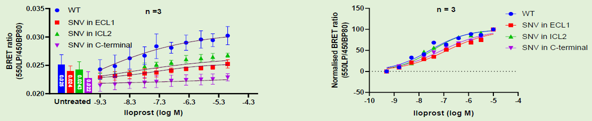 Graphs 1 and 2. SNV in the C-terminal region of the IP receptor seems to be significantly impacting the miniGs recruitment. SNVs in the ELC1 and ICL2 of IP receptor also show reduced recuitment. Image Credit: Image courtesy of Ravinder K. Bhardwaj et al., in partnership with ELRIG (UK) Ltd.
