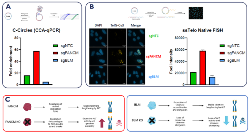 A. CCA-qPCR assay. C-circles are amplified from genomic DNA by rolling circle amplification, and fold change is detected using telomere-specific primers. B. Representative images from the Native-FISH assay where telomeric ssDNA is detected as nuclear foci by a TelG-Cy3 probe in U-2OS cells. Quantification of TelG-Cy3 foci intensity in U-2OS cells treated with control sgRNAs. C. Schematic depicting the function of established ALT control genes FANCM and BLM. Image Credit: Image courtesy of Manners O et al., in partnership with ELRIG (UK) Ltd.