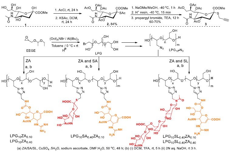 The development of heteromultivalent polyglycerol-based polymers functionalized with both 6′-sialyllactose and zanamivir represents a significant advancement in antiviral polymer design. By targeting both hemagglutinin and neuraminidase on the influenza A virus, these dual-action polymers exhibit remarkable antiviral efficacy, achieving
