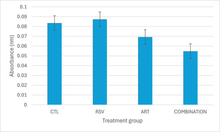 We established our baseline the MTT assay showed that both drugs are effective. ART is significantly more potent on its own, with an IC50 value of 7.8 μM (p=0.002), compared to RSV's IC50 of 34.4 μM. We used the IC50 values as the concentrations to conduct another MTT assay to determine whether there was a synergistic interaction between the drugs To investigate synergy, we utilised the SynergyFinder platform to analyse the interaction across four established mathematical models: Bliss, Loewe, HSA, and ZIP. The synergistic relationship between ART and RSV was consistent across all four models: the large green area in each plot confirms that ART and RSV are synergistic across a range of concentrations.