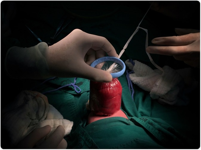Gastroschisis can also be reduced via primary closure or staged closure. Once the reduction is performed, the skin defect may be closed with traditional suture closure or with a biologic closure using the remnant of the umbilical cord.