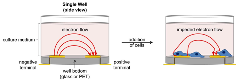 Figure 3. Principle of the cellular impedance xCELLigence assay. Image Credit: Adapted from Agilent, www.agilent.com/en/technology/cellular-impedance