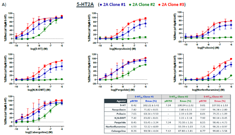Figure 4. 5-HT2 receptor agonists show expression-dependent potency and efficacy profiles at 5-HT2A and 5-HT2B receptors. Agonist DRCs were normalised to DMSO (min control) and 10 μM 5-HT (max control) and plotted for 5-HT2A (A) and 5-HT2B (B) stable cell clones. Mean duplicate data from three independent runs (n=2/N=3) is shown ± SEM. Mean agonist potencies (pEC50) and mean Emax ± SEM are tabulated for each clone. Image Credit: Image courtesy of Sophie O’Neil et al., in partnership with ELRIG (UK) Ltd.