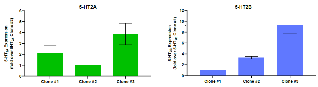 Figure 1. Quantification of 5-HT2A/5-HT2B receptor expression by RT-qPCR. 10 ng of cDNA was used for qPCR with PowerUpTM SYBR Green Master Mix. Transcript levels were normalised to GAPDH and expressed relative to the lowest expressing clone using the 2-ΔΔCt method. Mean triplicate expression data ± SEM is shown. (n=3/N=3). Image Credit: Image courtesy of Sophie O’Neil et al., in partnership with ELRIG (UK) Ltd.
