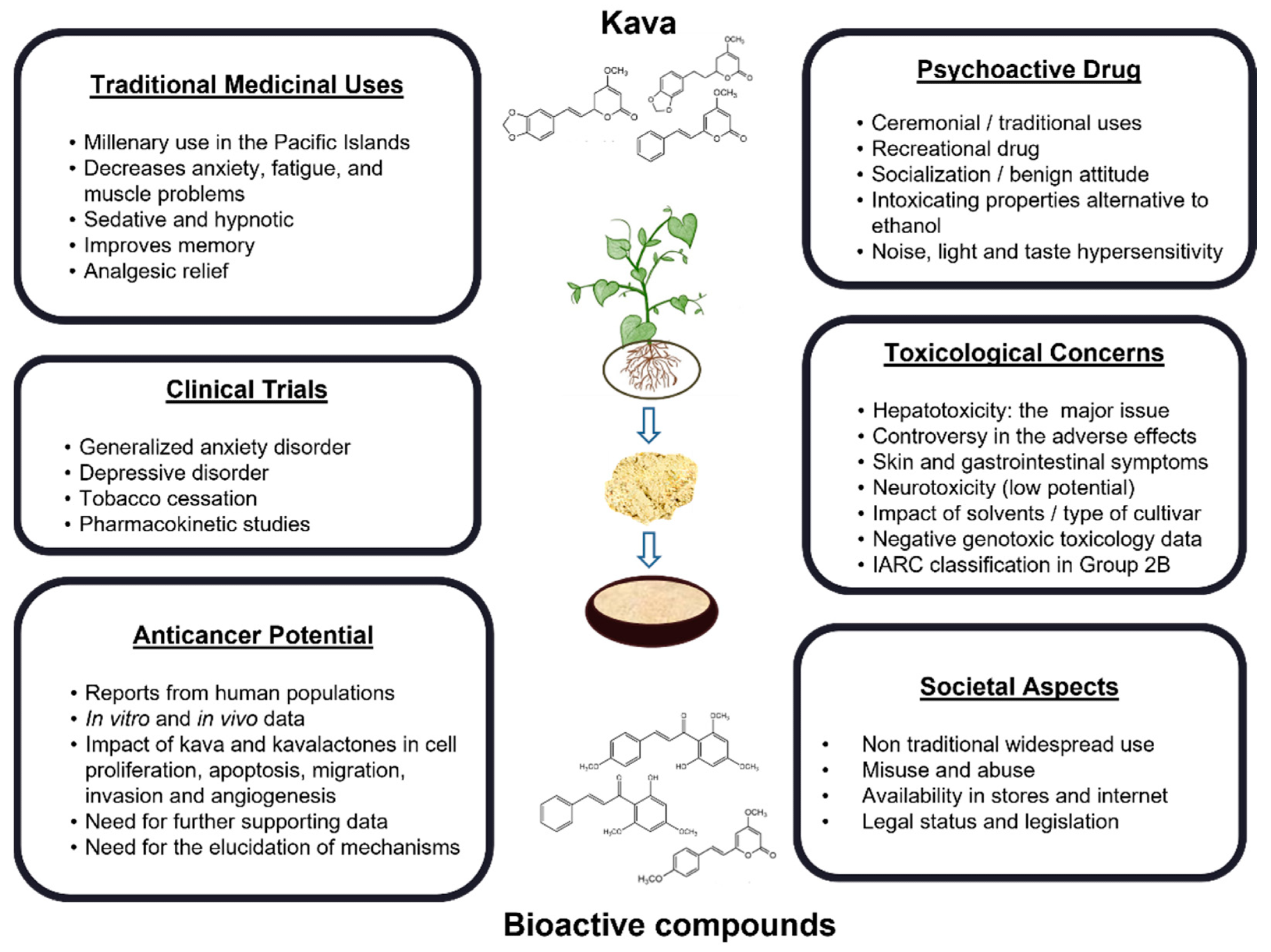 2. Soares, R. B., Dinis-Oliveira, R. J., & Oliveira, N. G. (2022). An updated review on the psychoactive, toxic and anticancer properties of kava. Journal of clinical medicine, 11(14), 4039. DOI:10.3390/jcm11144039, https://www.mdpi.com/2077-0383/11/14/4039