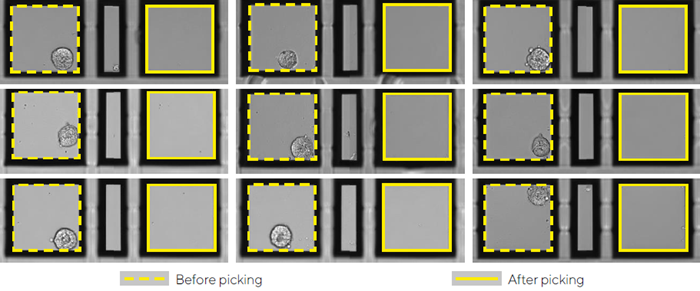 • The CellCelector removed each spheroid from its nanowell and resuspended it in hydrogel.