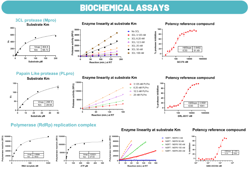 Biochemical assay: For the two viral proteases and the polymerase enzymes. For all the enzymes, they reported the Km calculation for the substrate, the enzymatic linearity at substrate Km, and the profile of the reference molecule.
