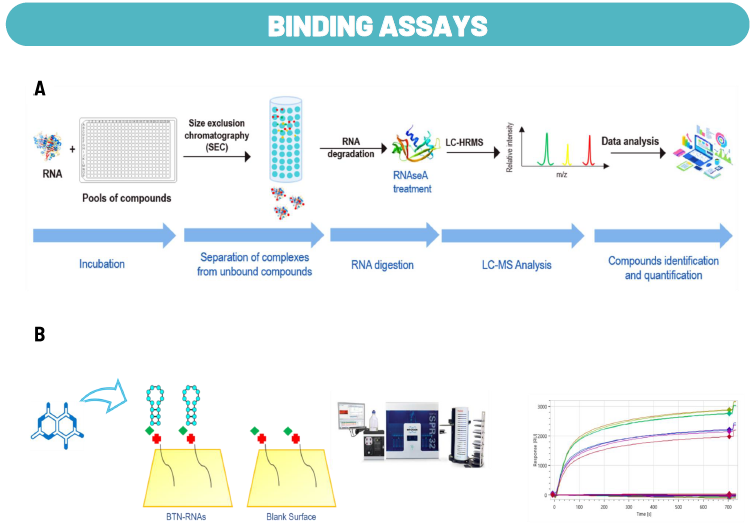 Binding assay: Two in vitro RNA binding assays were developed, including an AS-MS approach (A), which allows for the identification of molecules that specifically interact with the viral 5'UTR in vitro, and the Surface Plasmon Resonance (SPR) as a refining technique to evaluate interactions with specific stem and loop structures (B).