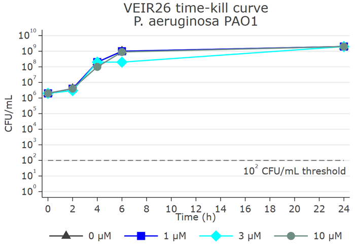 Dose-dependent swarming inhibition by VEI-0026 against multi-drug resistant (MDR) P. aeruginosa clinical isolate (trachea). IC50 ~200 nM. The result is representative of efficacy against sputum, urinary tract, skin and wound infection MDR isolates. All tested isolates are resistant to β-lactams (including carbapenems), aminoglycosides, and fluoroquinolones