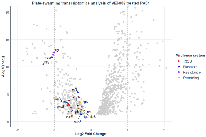 Figure 3. Transcriptomic analysis of P. aeruginosa on a swarming plate treated with VEI-008 (vs untreated). Significant differentially expressed genes that play a key role within clinically relevant systems - T3SS, elastases, swarming, and antibiotic resistance - are highlighted to demonstrate a broad suppressive effect on P. aeruginosa acute virulence behavior. Image Credit: Image courtesy of Rory Triniman et al., in partnership with ELRIG (UK) Ltd.