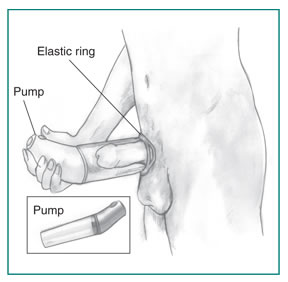 These devices are shaped like an external cylinder fitted over the penis to allow air to be pumped out. This results in engorgement of penis with blood. This helps best when the partner is understanding and motivated. Side effects include pain, bruising and numbness.