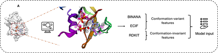 Figure 1. A) Molecular interaction visualization and feature combination. Crystal structure of protein with PDB ID: 1AFK, highlighting interactions with the ligand PAP (3′-Phosphate-Adenosine-5′-Diphosphate). Fuchsia spheres represent atoms in closest contact with the ligand (cutoff within 2.5 Å). Black arrows indicate hydrogen bonds, red dashed lines represent salt bridges, and blue dashed lines denote π–π stacking interactions. SCORCH2 features are primarily generated from three methods: BINANA, ECIF, and RDKit. While BINANA and ECIF extract conformation-sensitive features, RDKit provides features that remain independent of conformational changes. B) SCORCH2 structure and model training. SCORCH2 uses a simplified architecture consisting of two XGBoost models. Each model is trained with different data, and Optuna is used for optimal parameter search with appropriate training strategies. C) SCORCH2 inference workflow, for the complex data, these models are designed to operate independently, and the final result is provided by a weighted consensus. Image Credit: Image courtesy of Lin Chen et al., in partnership with ELRIG (UK) Ltd.