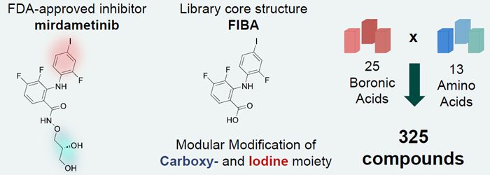The library design consisted of an FDA-approved inhibitor mirdametinib, a core structure of FIBA, and 325 compounds (25 boronic acids x 13 amino acids).