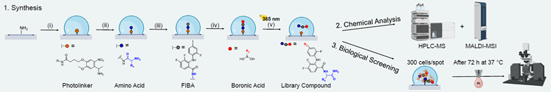 The workflow process from synthesis, to chemical analysis and biological screening.