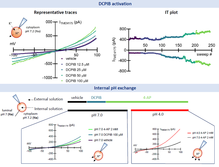 - DCPIB clearly activates TMEM175 currents at the lysosomal level, with an EC50 comparable to that observed in whole-cell recordings.