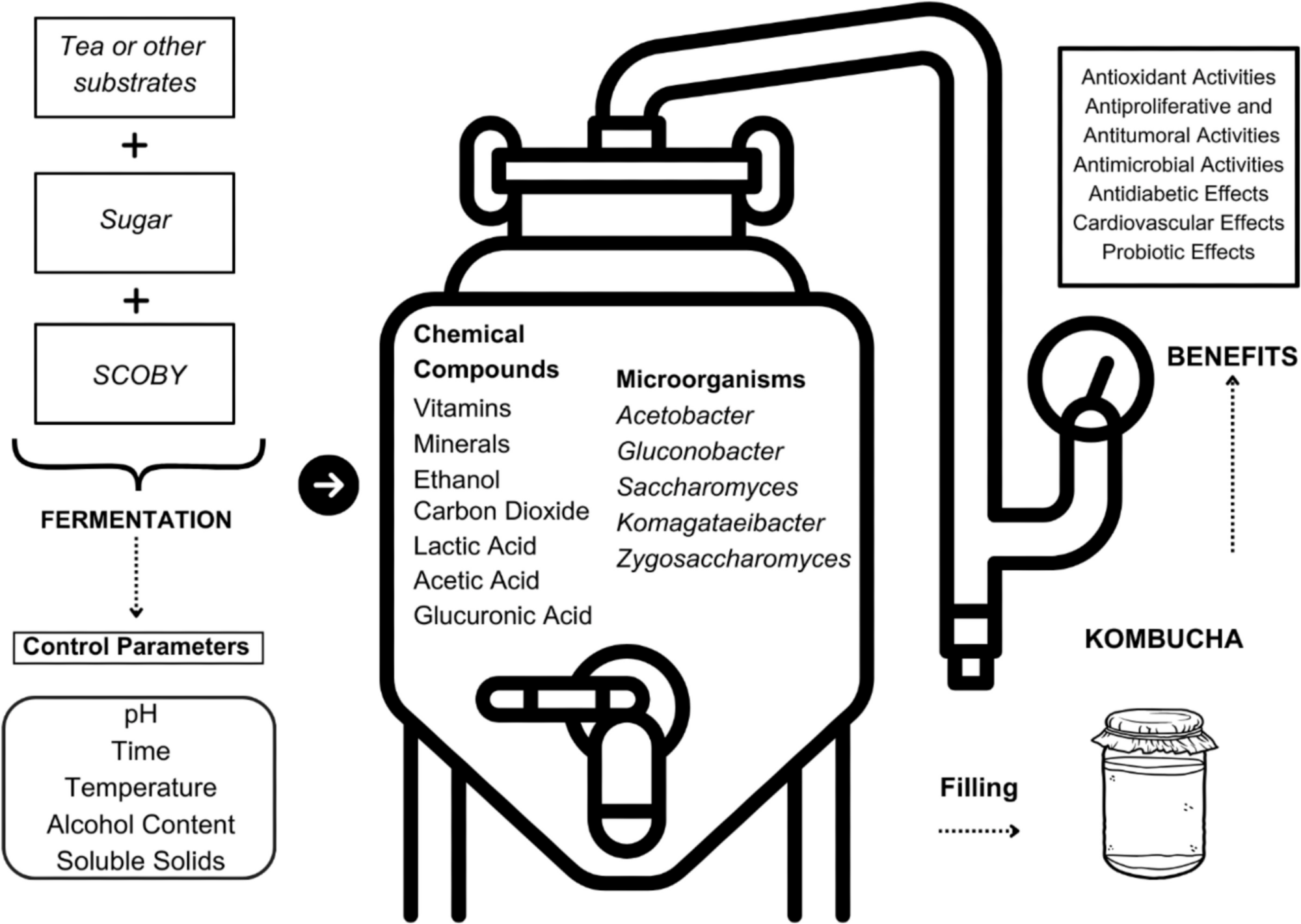 3. Antolak H, Piechota D, Kucharska A. (2021) Kombucha Tea—A Double Power of Bioactive Compounds from Tea and Symbiotic Culture of Bacteria and Yeasts (SCOBY). Antioxidants. 10(10). DOI:10.3390/antiox10101541, https://www.mdpi.com/2076-3921/10/10/1541