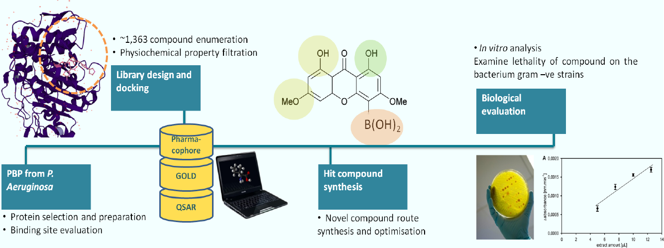 Our aims were to use rational drug design, pharmacophore analysis and structure-based virtual screening methods to identify novel covalent small molecule inhibitors which will target the PBP of P. aeruginosa. The novel molecules were identified, some were synthesized accordingly, and their antimicrobial activities were and (are being) evaluated in vitro using various gram-positive and negative strands of bacteria such as P. aeruginosa and E. coli.